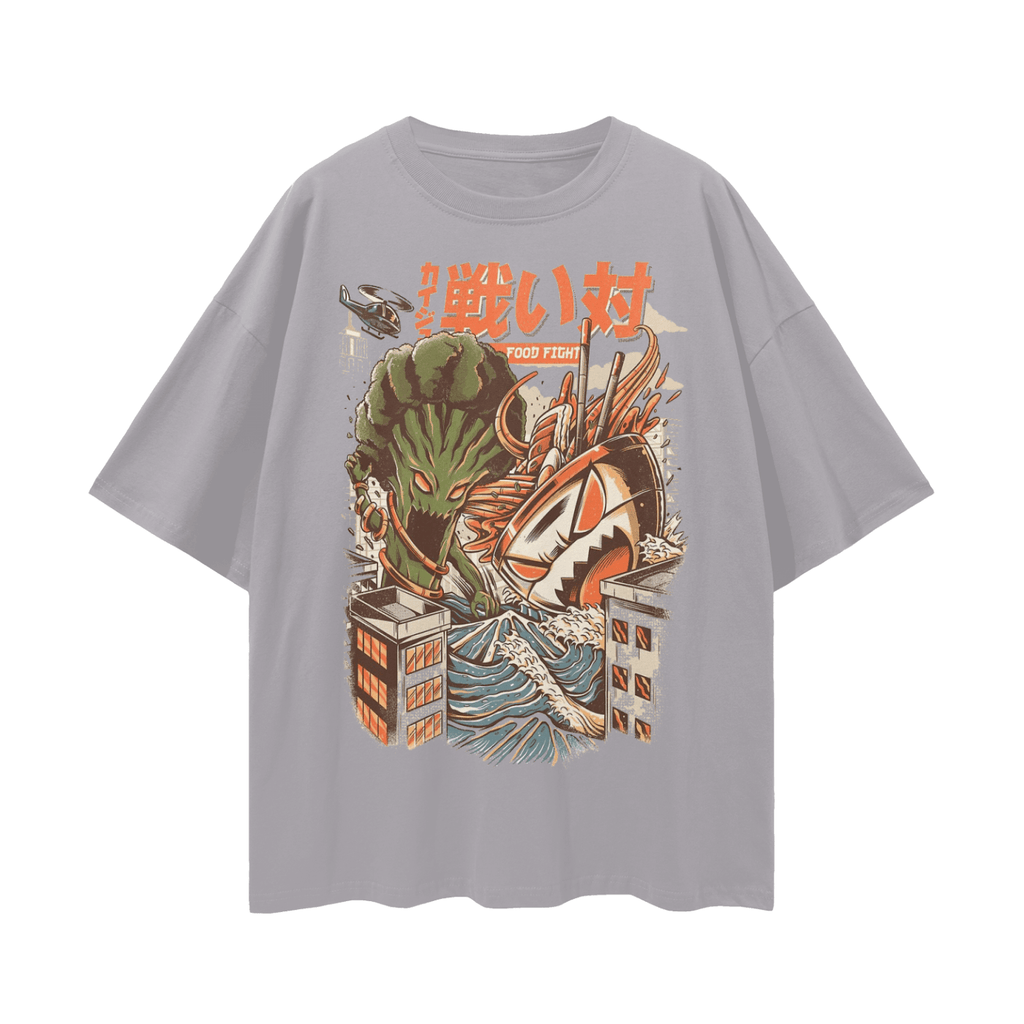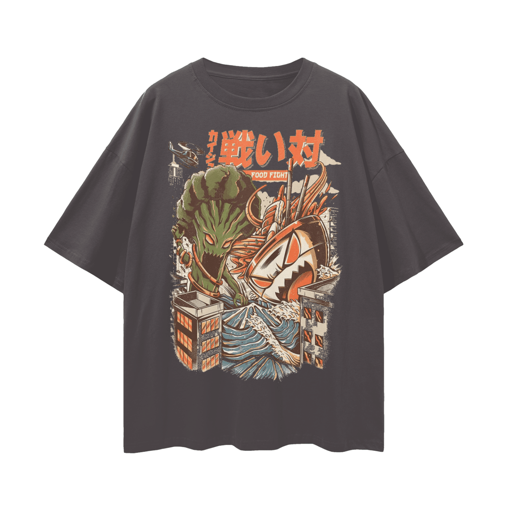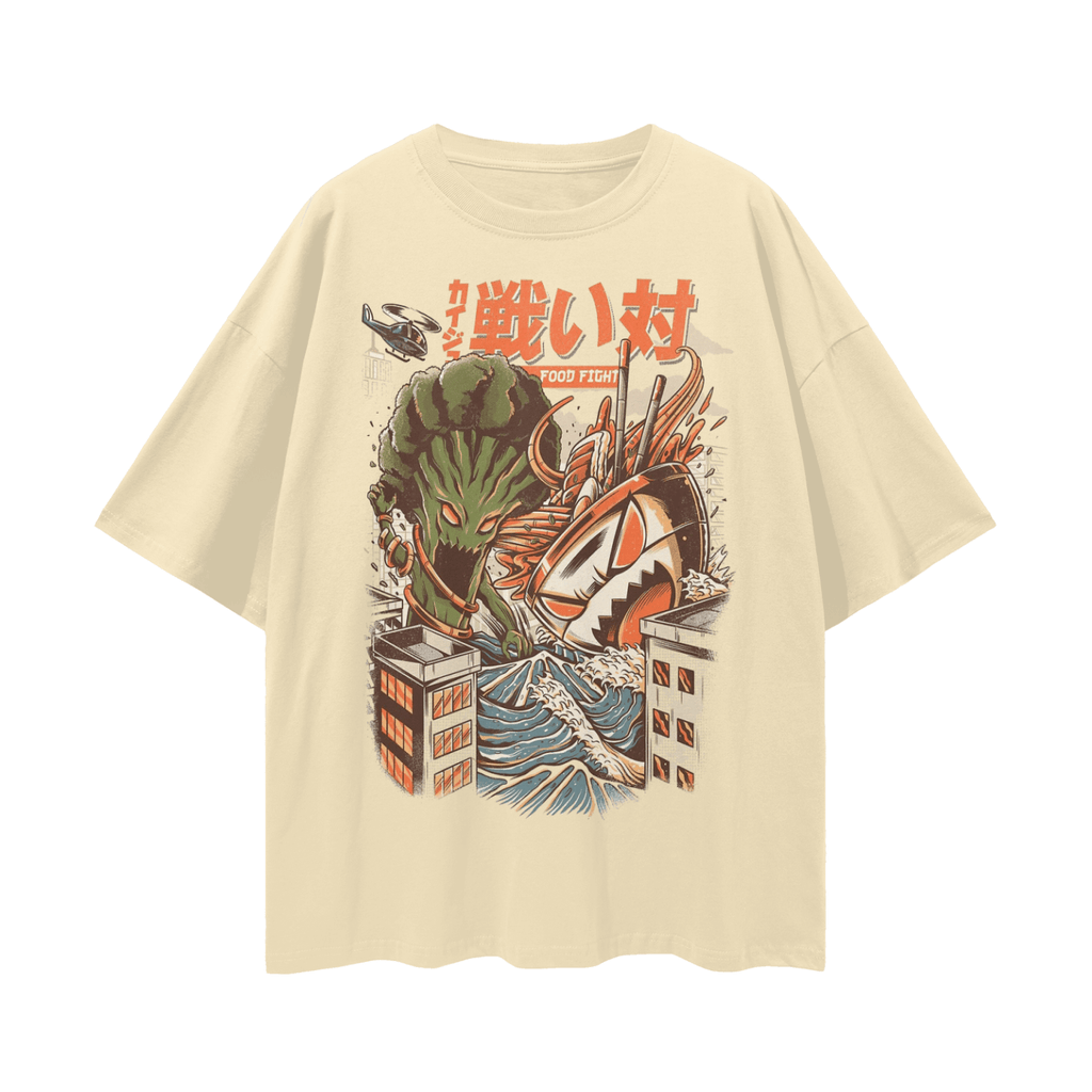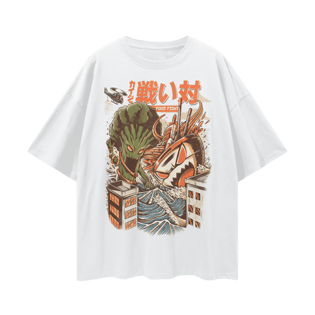 Enhance your casual style with the FNDMNTLS Food Fight Oversize Deep Drop Shoulder Graphic Tshirt. Crafted for both comfort and contemporary fashion, this unisex tee features a relaxed, loose fit and pronounced drop shoulders for an effortlessly cool aesthetic. The bold graphic, measuring 40x52cm, adds a playful touch, allowing you to express your personality with ease. Made from 100% moderate-weight cotton (5.6 oz/yd² or 190 g/m²) with slight stretch, this tee provides all-day comfort. Ideal for everyday wear, from lounging at home to outdoor adventures, this drop shoulder graphic tee seamlessly blends trend-forward design with lasting comfort. Item Number: R00131.