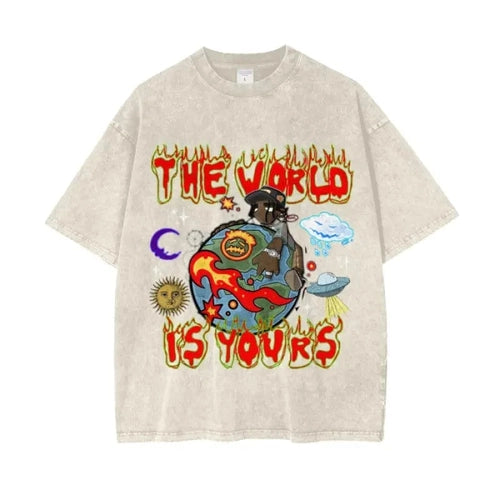 You do know the world is yours, right? Step into confidence and style with the Infinity Links World Acid Wash Oversize T-Shirt. Designed for rebels who know their worth, this oversize t-shirt features a bold rasta cartoon character standing triumphantly on top of the world—symbolizing your limitless potential.